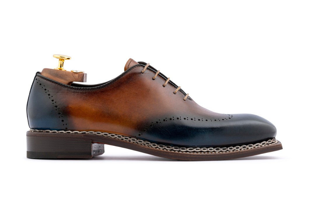 Very elegant string in painted leather and blended by hand, an authentic derby style masterpiece with a distinctive aura. The impeccable Norwegian processing gives prestige, while the refined swallowing decoration on the tip adds a touch of refined elegance. The precious leather sole further underlines the luxury of this extraordinary fit.