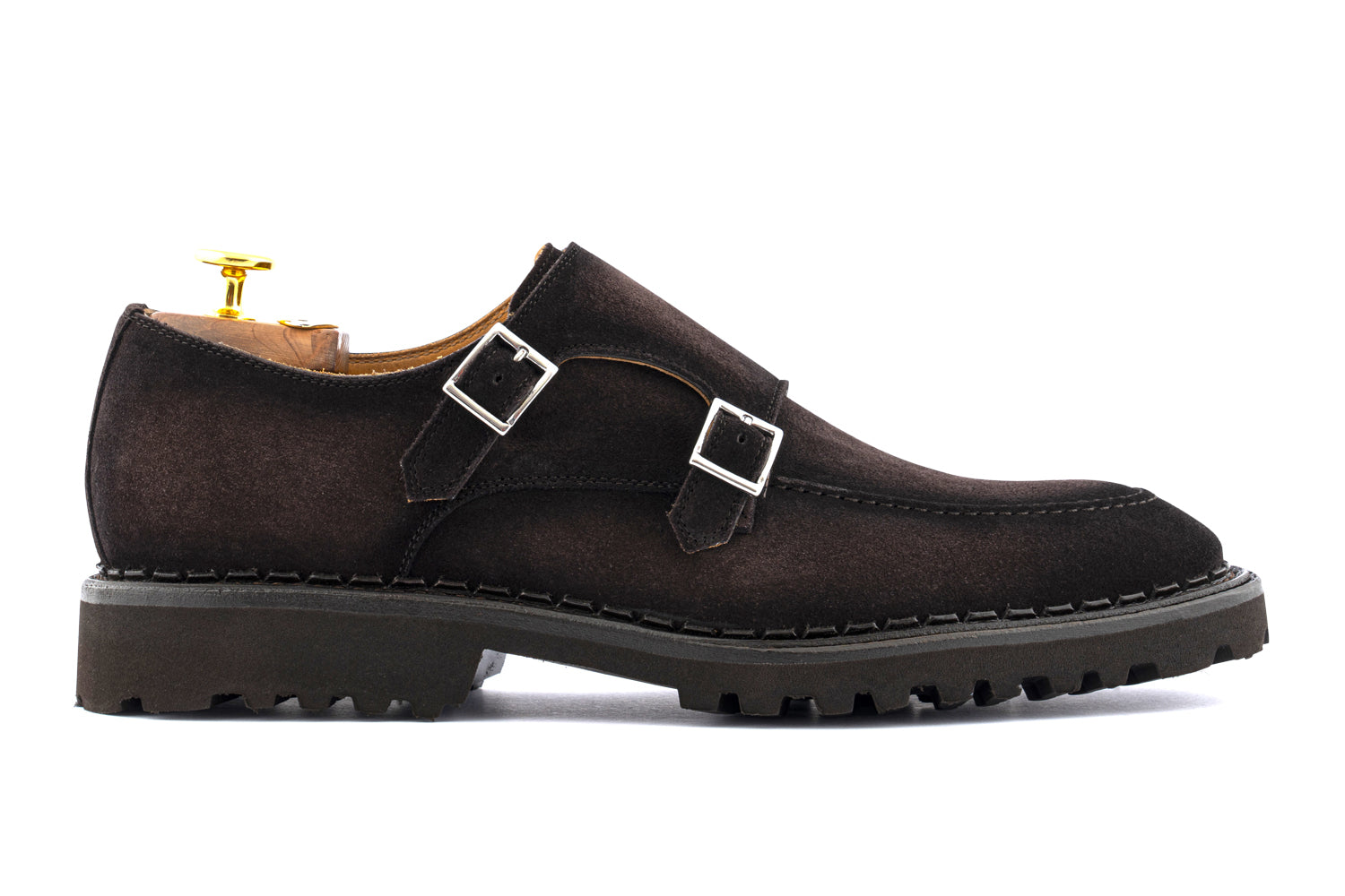 A model that combines elegance, solidity and authentic personality. This double buckle is made of shaded suede in shades of brown, the stitching on the edge highlights the attention to detail while the lug rubber sole with stitched welt in a warm honey yellow shade gives character and a contemporary touch.