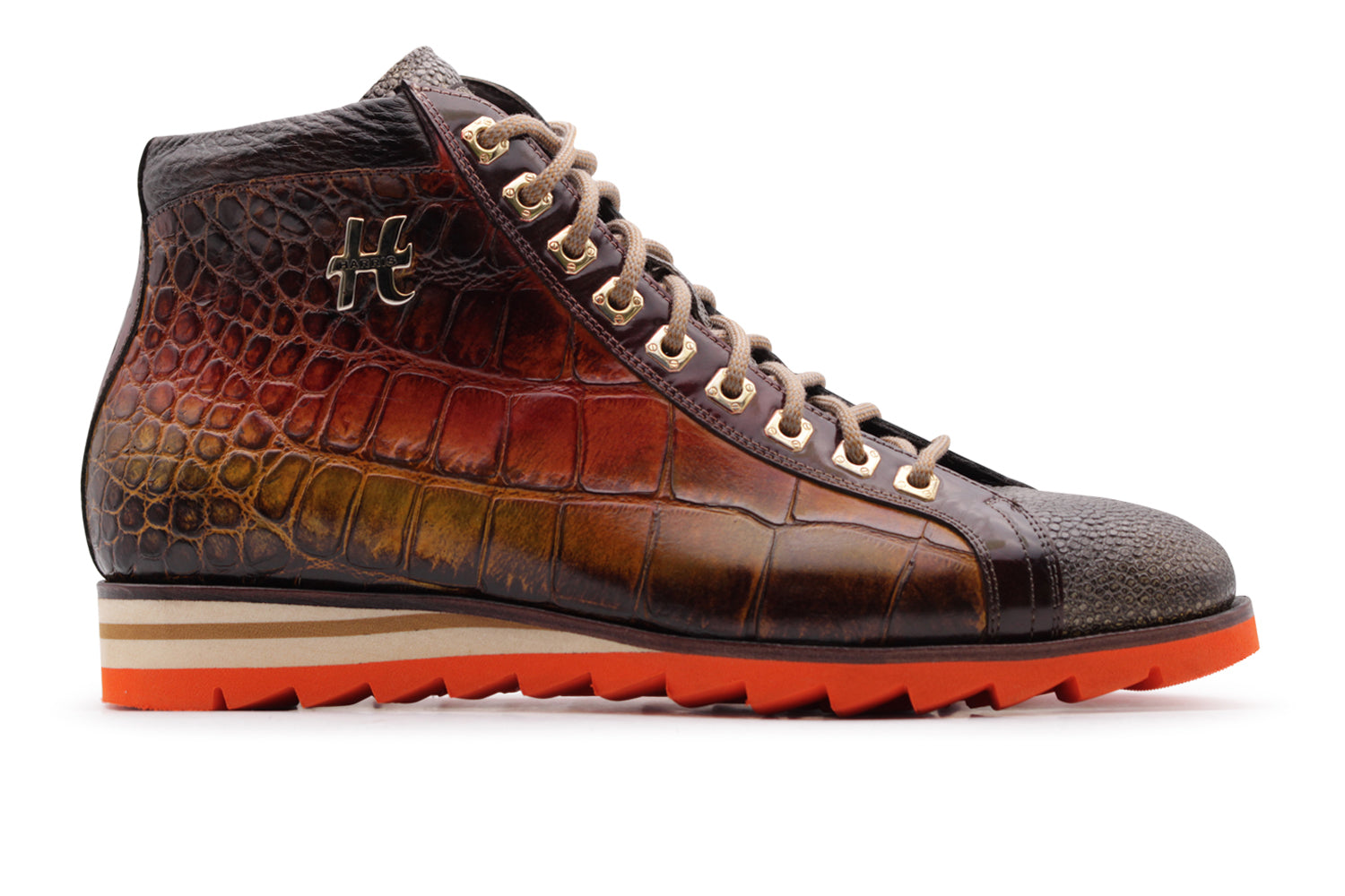 Made of crocodile effect printed veal leather and entirely hand -painted, it is enriched by a refined python tongue and by Moro's head details. Harris accessories in gold finish underline the value of the shoe, while Blake Rapid processing guarantees resistance and durability. Complete the Harris Runner rubber sole that offers comfort and practicality without giving up elegance.