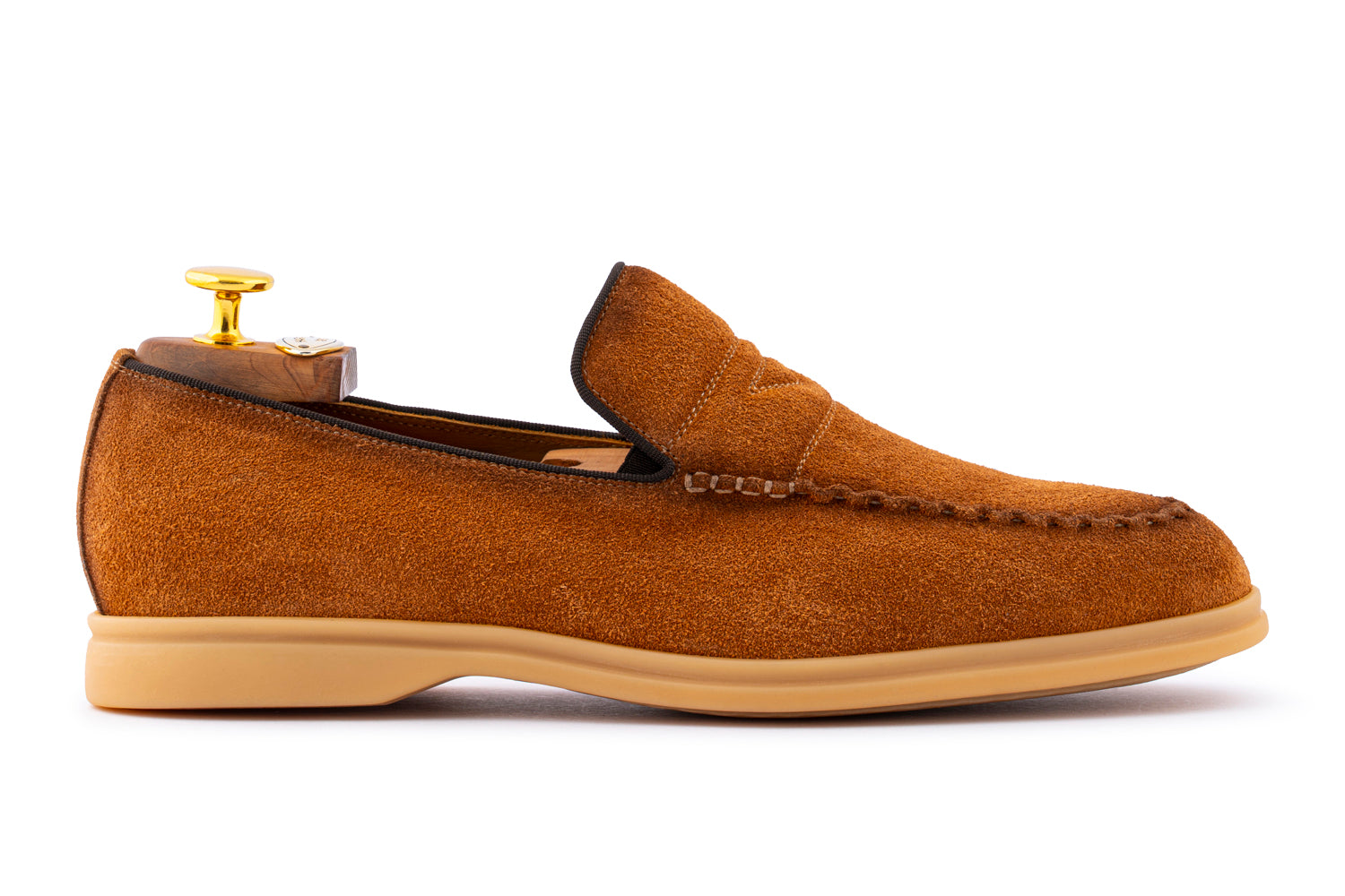 Pelle scamosciata color beige, delicatamente sfumata. Caratterizzato da passante imbottito e preziose cuciture manuali, questo modello monta una suola in gomma leggera color miele con montaggio Blake Rapid.