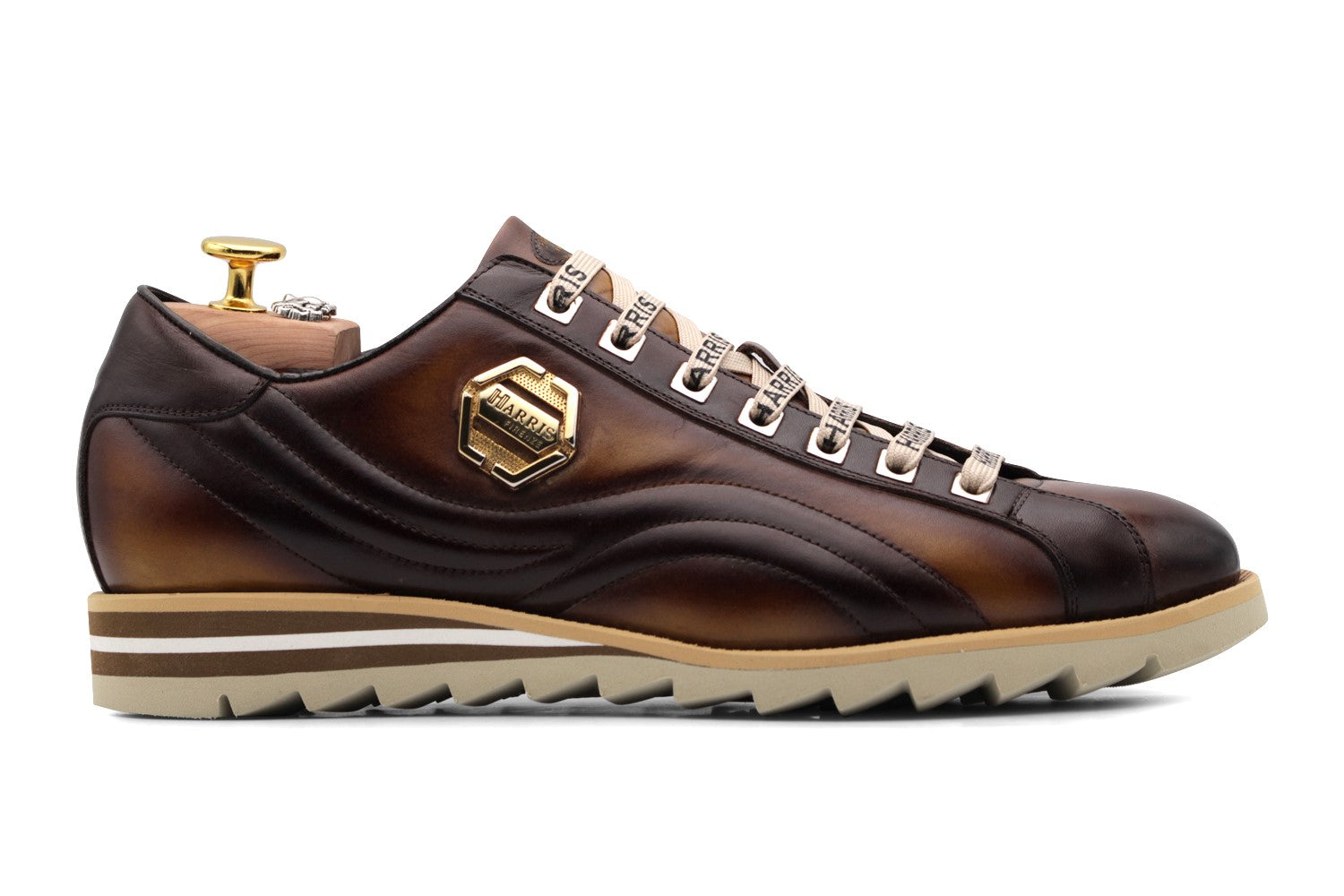 Nuestra zapatilla de deporte de cuero es el equilibrio perfecto entre el estilo contemporáneo y la habilidad artesanal. Hecho de cuero de ternera completo pintado a mano en los tonos de marrón, se destaca para un diseño que combina elegancia y versatilidad. La suela flexible garantiza la comodidad durante todo el día, mientras que los acabados pintados a mano y los detalles separados, como la plaqueta de Harris, mejoran una estética exclusiva y buscada.