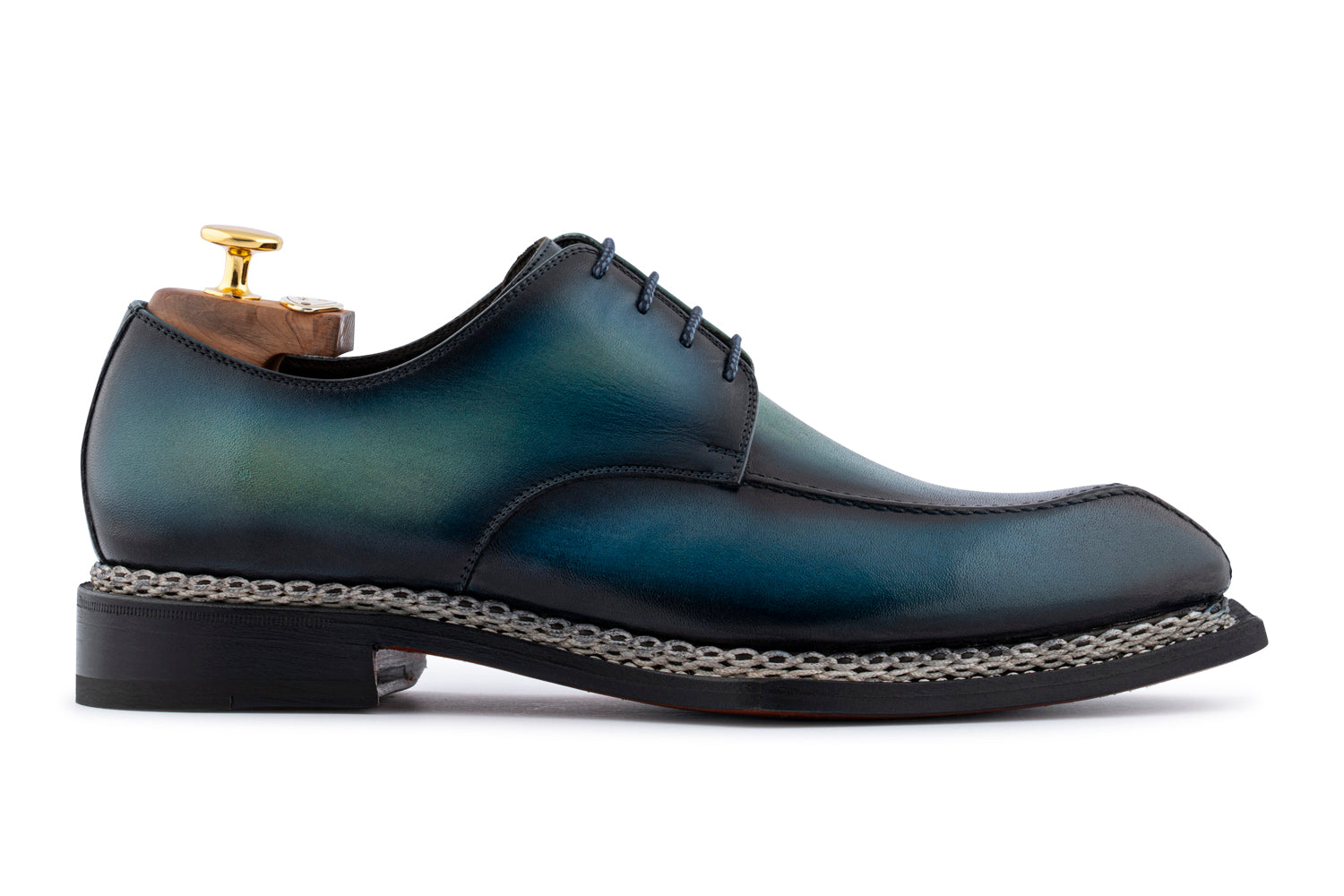 Ce modèle Derby, en cuir de veau à flux complet, est peint à la main pour un résultat exclusif et artisanal. Derby Laçage et le traitement norvégien améliorent sa qualité et sa robustesse, donnant au modèle une structure solide et un charme intemporel. Terminé par une semelle en cuir, il offre une élégance, un confort et une résistance.