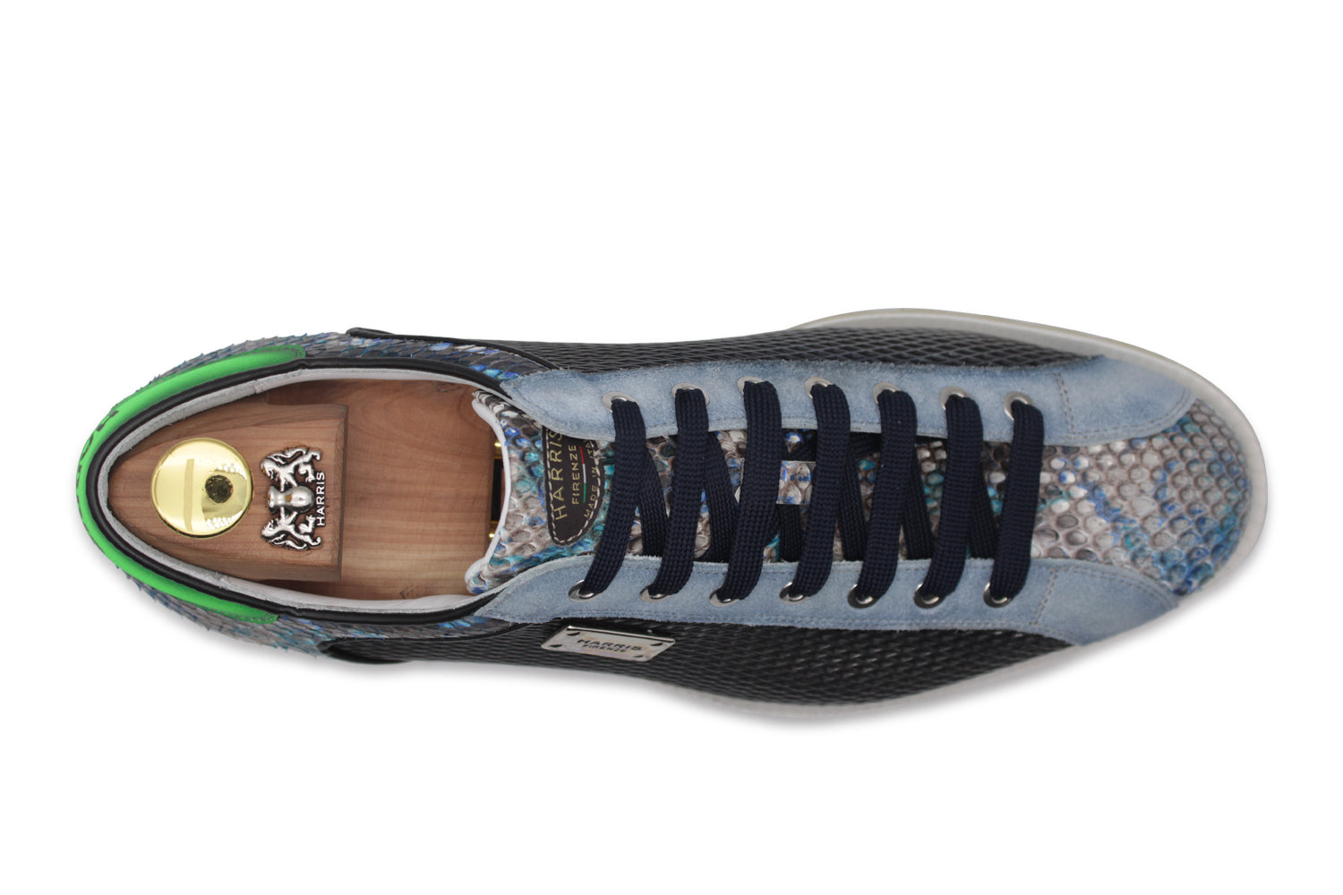 L'élégance magnétique de la couleur métal fumé caractérise ce cuir imprimé perforé, agrémenté d'empiècements en véritable python. Les accessoires en nickel et la finition Blake Rapid sur la semelle de course créent une combinaison parfaite entre design avant-gardiste et haute tradition de la chaussure.