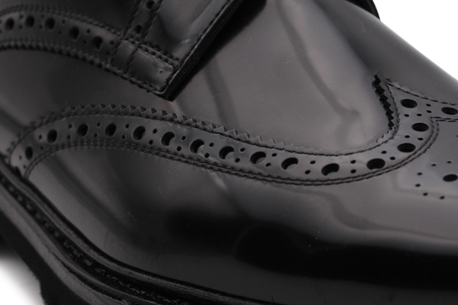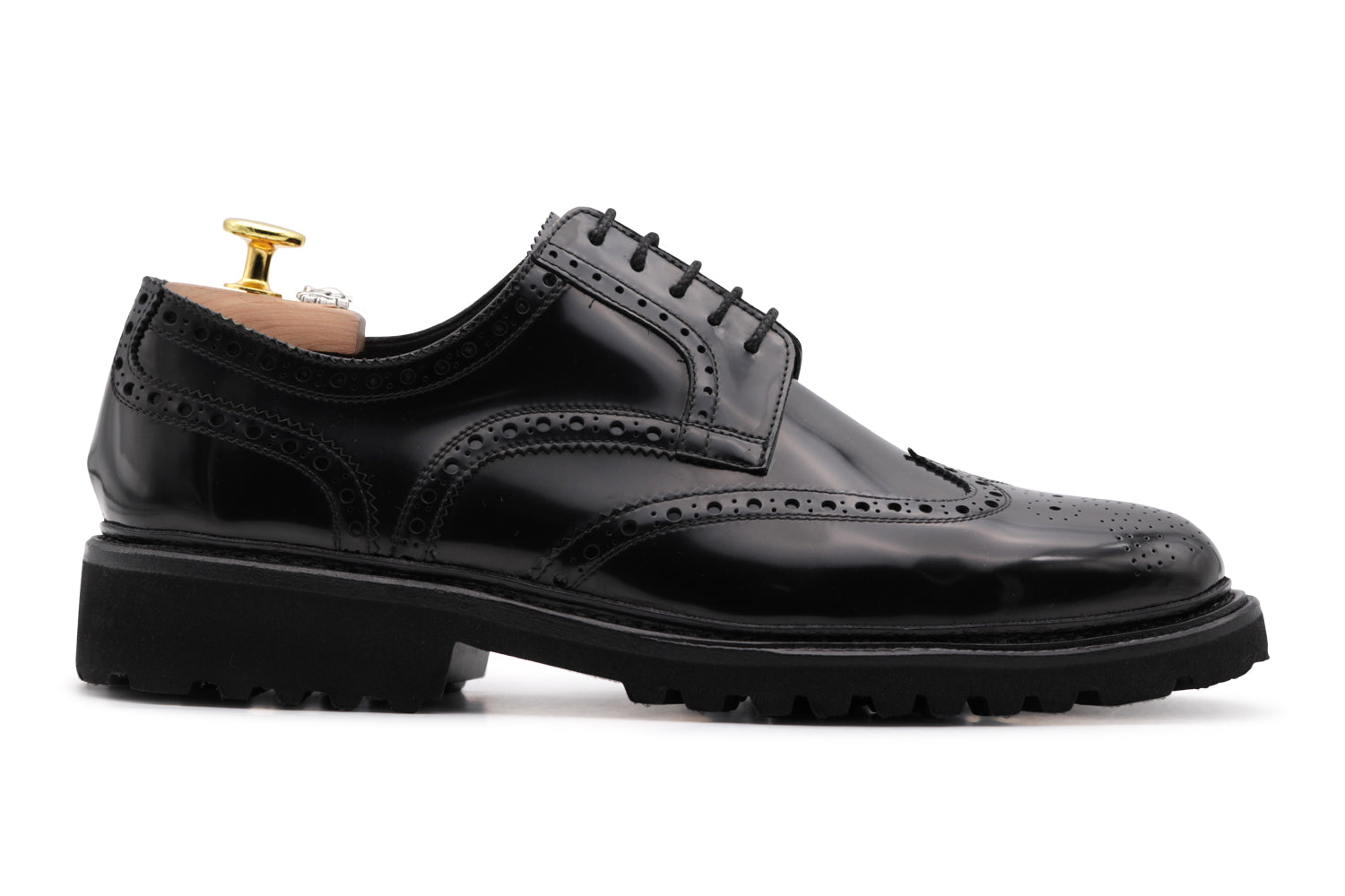 Derby in pelle spazzolata nera lucida, impreziosita da dettagli bragué e completata da una suola carrarmato in gomma. Il guardolo cucito e la lavorazione Blake Rapid creano un equilibrio perfetto tra eleganza formale e carattere urbano.
