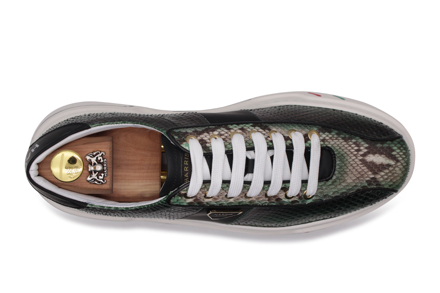 Realizzata in pregiata pelle di pitone nei toni del verde e del nero, questa sneaker è impreziosita da accessori in finitura oro che impreziosiscono il design. A completare il modello, la suola a cassetta Innovazione che assicura comfort e stabilità, esaltando uno stile che combina lusso, artigianalità e stile moderno.