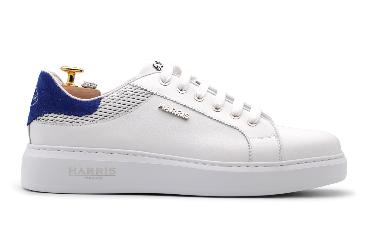 Sneaker realizzata in morbida pelle di vitello stampa alce color bianco, con riporti stampati e dettagli in suede rosso completata da accessori Harris in finitura oro e la suola a cassetta bianca che conferiscono un design ricercato